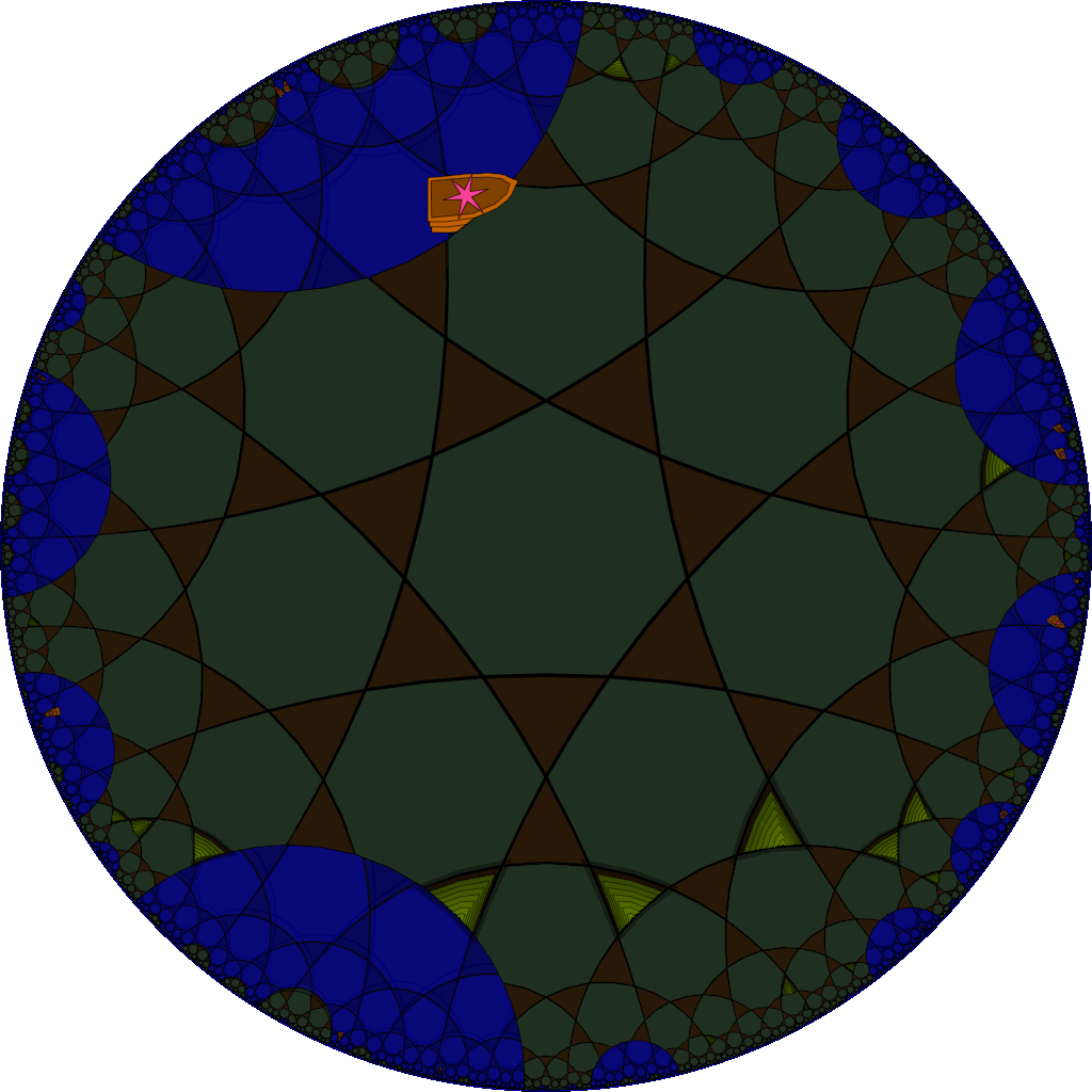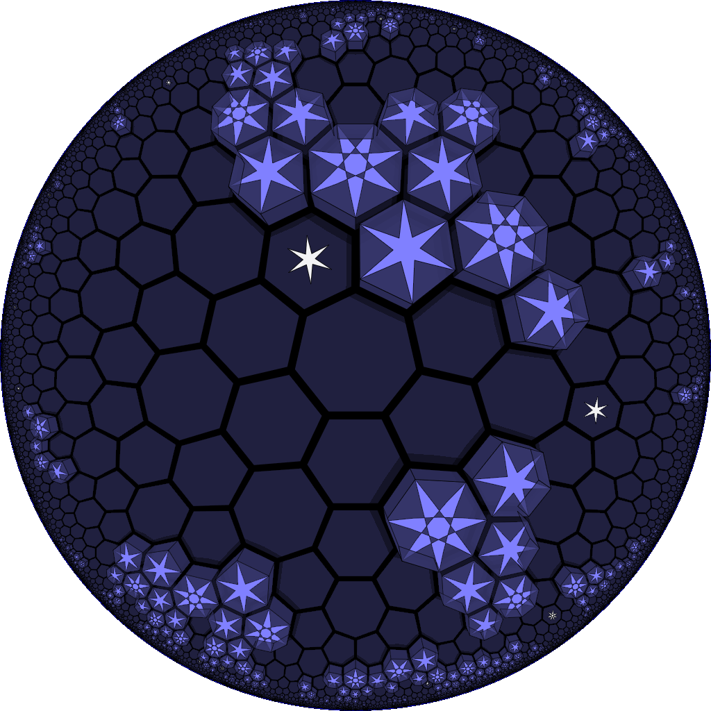 For completeness, we will also analyze what other tilings are HyperRogue-like. It turns out any regular hyperbolic tilings works for this; with the default tesselation being its truncation and the warped variant being its rectification. This is consistent with what HyperRogue uses, with the base tiling being the order-7 triangular tiling {3,7}.